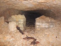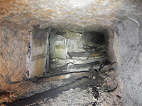 Bij dit staketsel splitst de gang zich in vier richtingen. Wanneer je hier tijdens een bezoek onder staat, zul je echter maar drie richtingen zien. Let goed op: de gang naar de uitgangen richting de frontlinie is dichtgemetseld met een dikke natuurstenen muur. Je kunt hier echter nog wel overheen klimmen. Op de foto zie je in de linker bovenhoek één van onze frontratten die door het gat aan het klimmen is. De fotoreportage neemt hier ook even een wending, we bespreken eerst de zij-ingangen die beiden op dit kruispunt uitkomen, daarna bespreken we de hoofdtunnel welke kaarsrecht op Ausgang A gegraven is en daarna de aftakking naar Ausgang B.